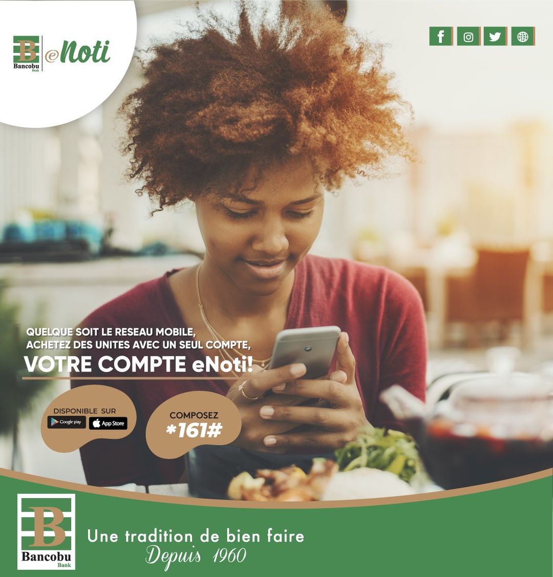 Quelque soit le réseau que vous utilisez vous pouvez les acheter avec eNoti. Restez connectés au monde.Téléchargez l'application Bancobu Bank ou passez par le code court *161# OK