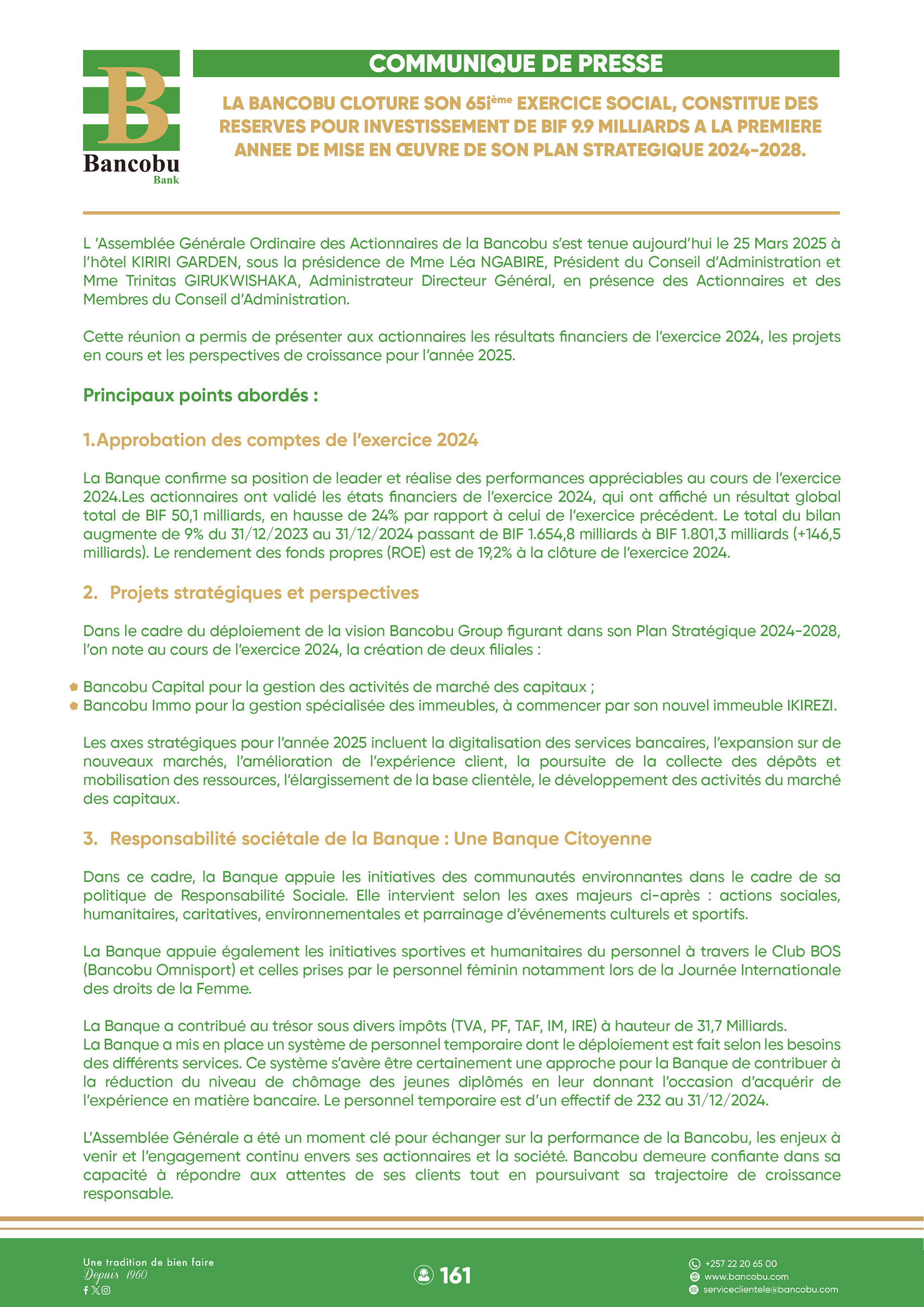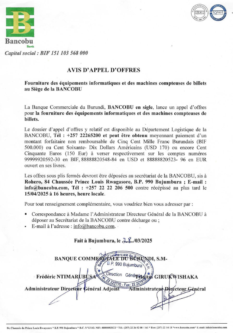Fourniture des équipements informatiques et des machines compteuses de billets au Siège de la BANCOBU La Banque Commerciale du Burundi, BANCOBU en sigle, lance un appel d'offrespour la fourniture des équipements informatiques et des machines compteuses de billets.